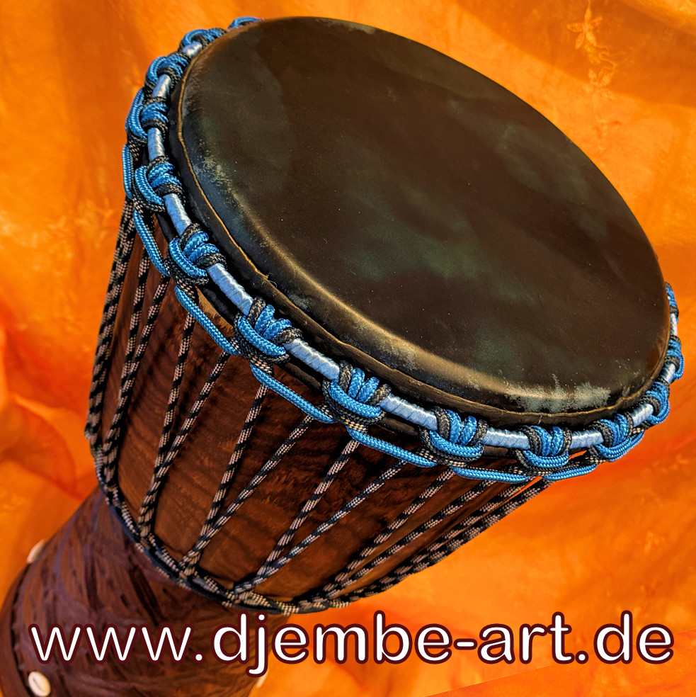 Herausragende Handwerkskunst von höchster Qualität. Besonders schöne, bunte und kontrastreiche Holzmaserung. Ebenmäßig geformt, sehr glatt geschliffen, poliert und mit Karitébutter geschützt. Vorgerecktes Qualitätstau, sechzehnfach geflochten, 5 mm Ø, Schwarz. Mit einer Mali-Masterdrumer Ziegenhaut bespannt.