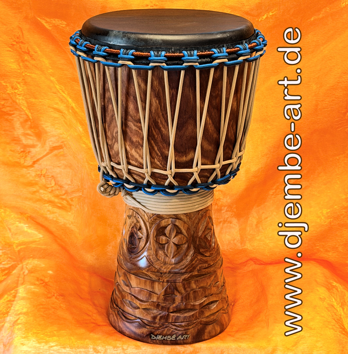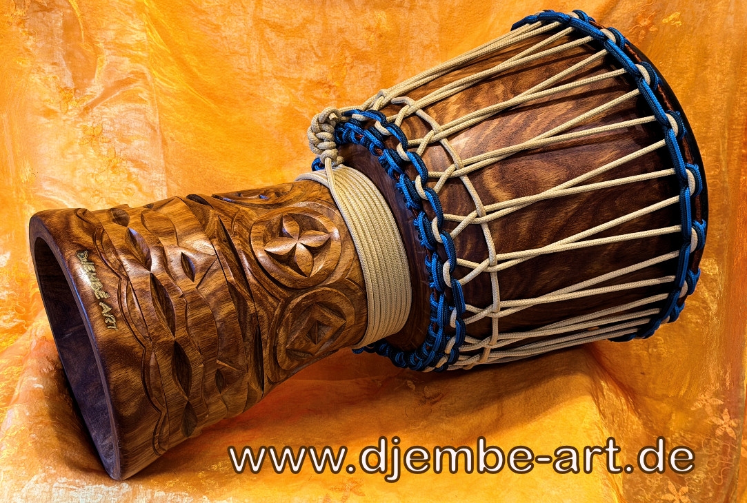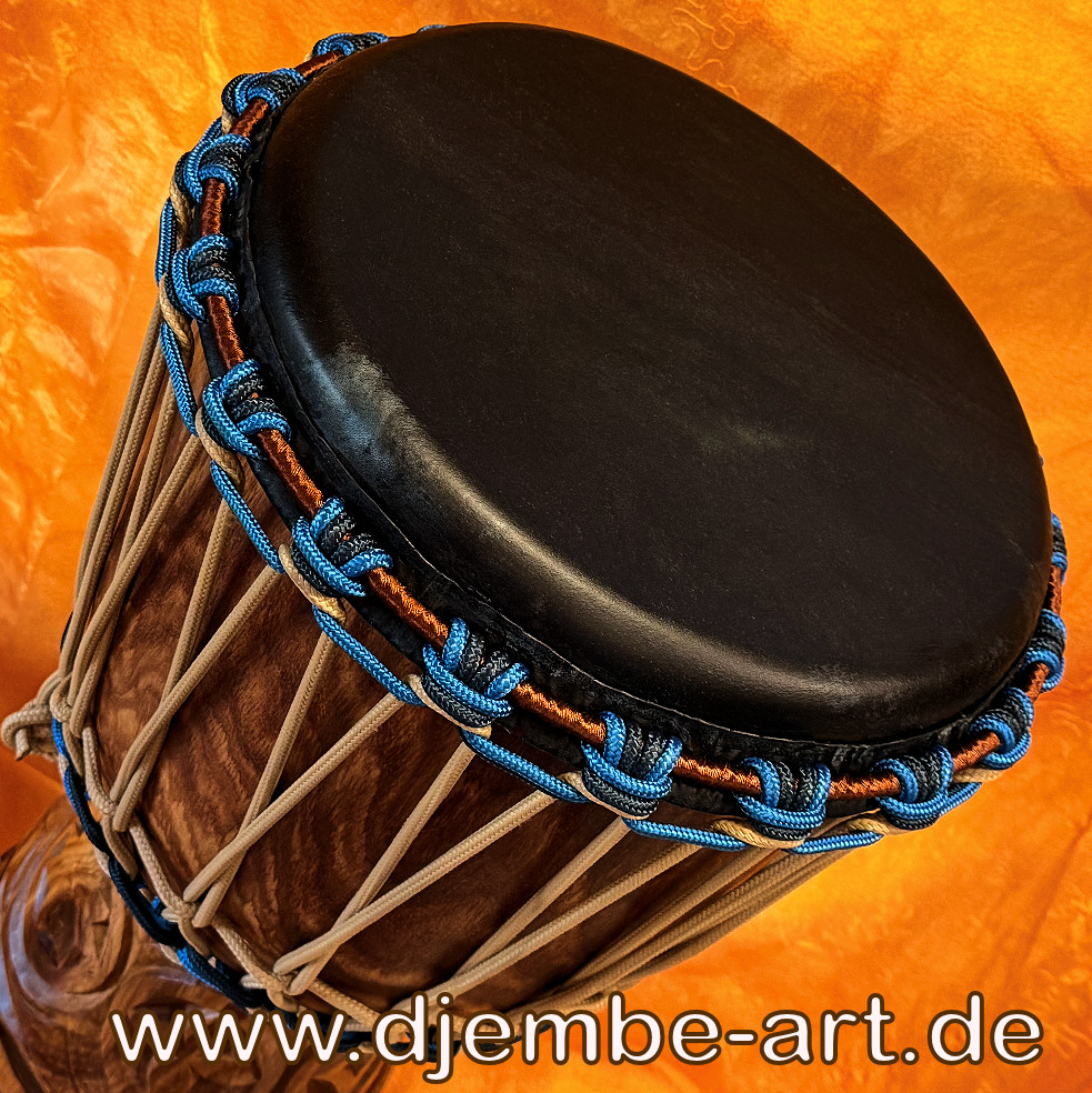 Finest craftmanship, very well carved, smooth finished, protected with fine oil,  pre-stretched rope 5 mm Ø, blue. Mali-King spotted premium goat skin.
